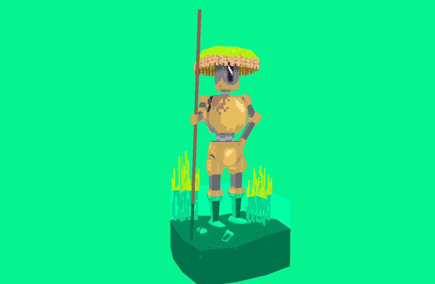 Walking through the Swamp there is a lone Rusty Boy. A type of self aware robot, in a world full of garbage.